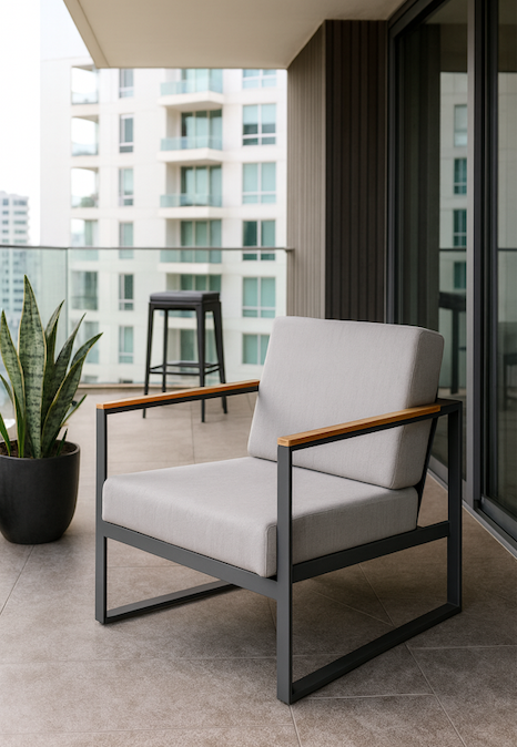 Sillón 1 cuerpo fabricado en base metálica de perfil 40 x 20 mm, acabado de pintura electroestica. Apoyo de brazo de madera de pino lacado. Cojines con tela de PVC resistente a la intemperie.
