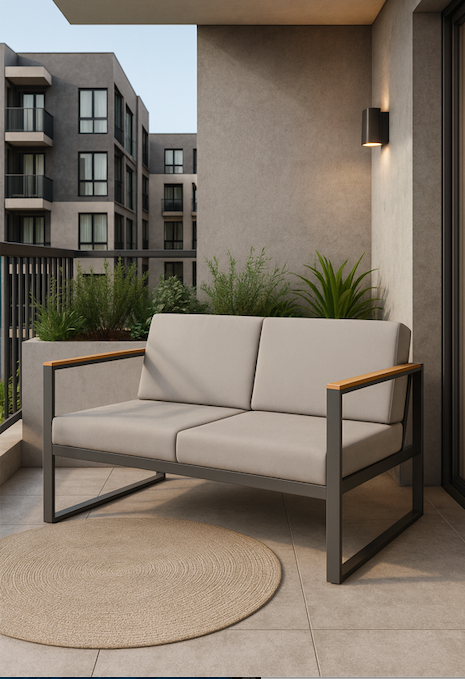 Sillón 1 cuerpo fabricado en base metálica de perfil 40 x 20 mm, acabado de pintura electroestica. Apoyo de brazo de madera de pino lacado. Cojines con tela de PVC resistente a la intemperie.